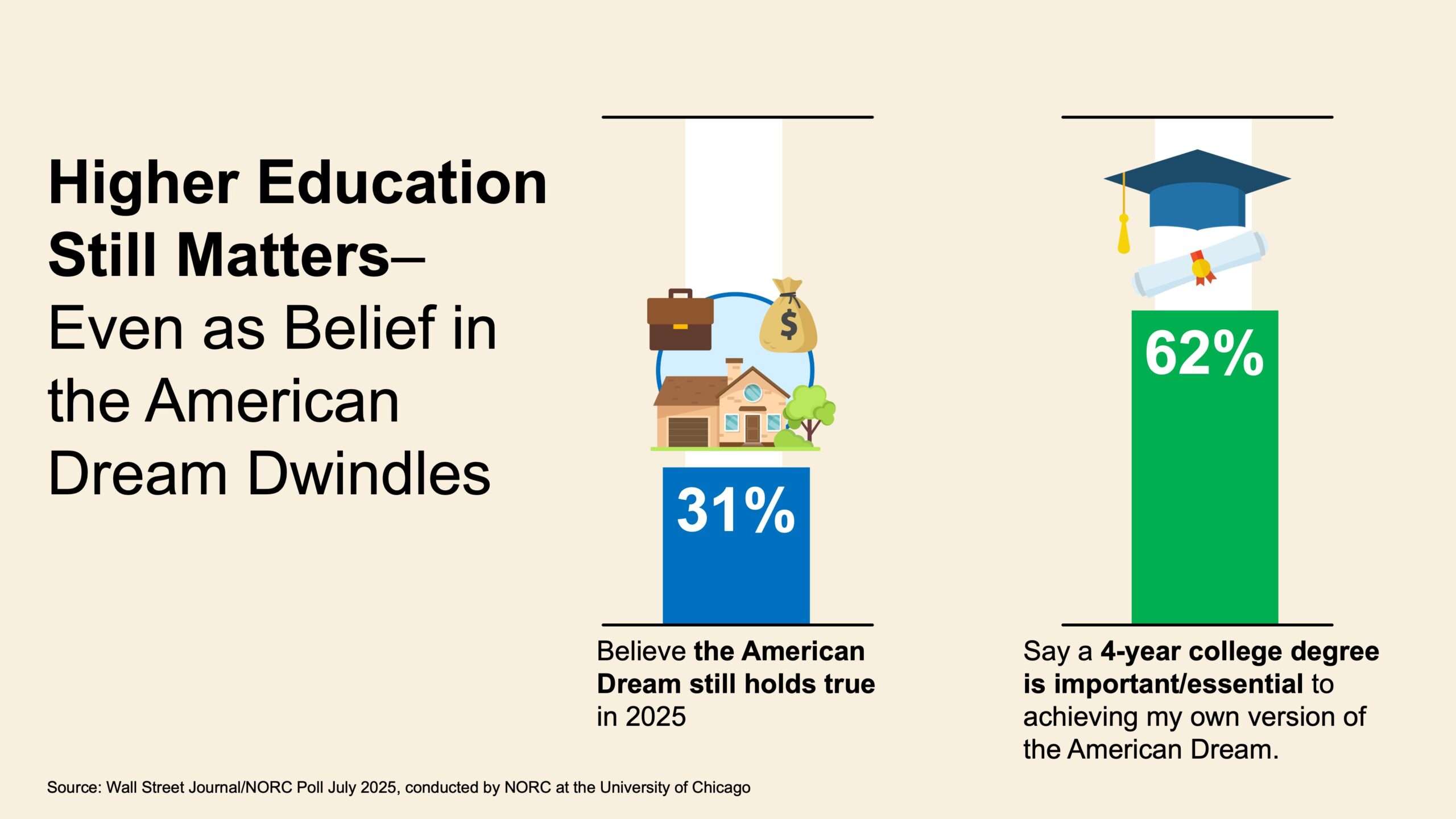 The Wall Street Journal/NORC poll revealed a notable shift. While belief in the American Dream continues to decline (only 31% believe it still holds true in 2025, down from 36% in 2023), 62% of respondents now say a 4-year degree is essential or important to achieving their own version of that dream—a figure that has grown in intensity from a year ago (from 57% overall in 2024, where 16% said essential in 2024 versus 22% who say so in 2025). This growing sentiment underscores the critical role of education in preparing individuals not just for jobs, but for meaningful careers and lives.