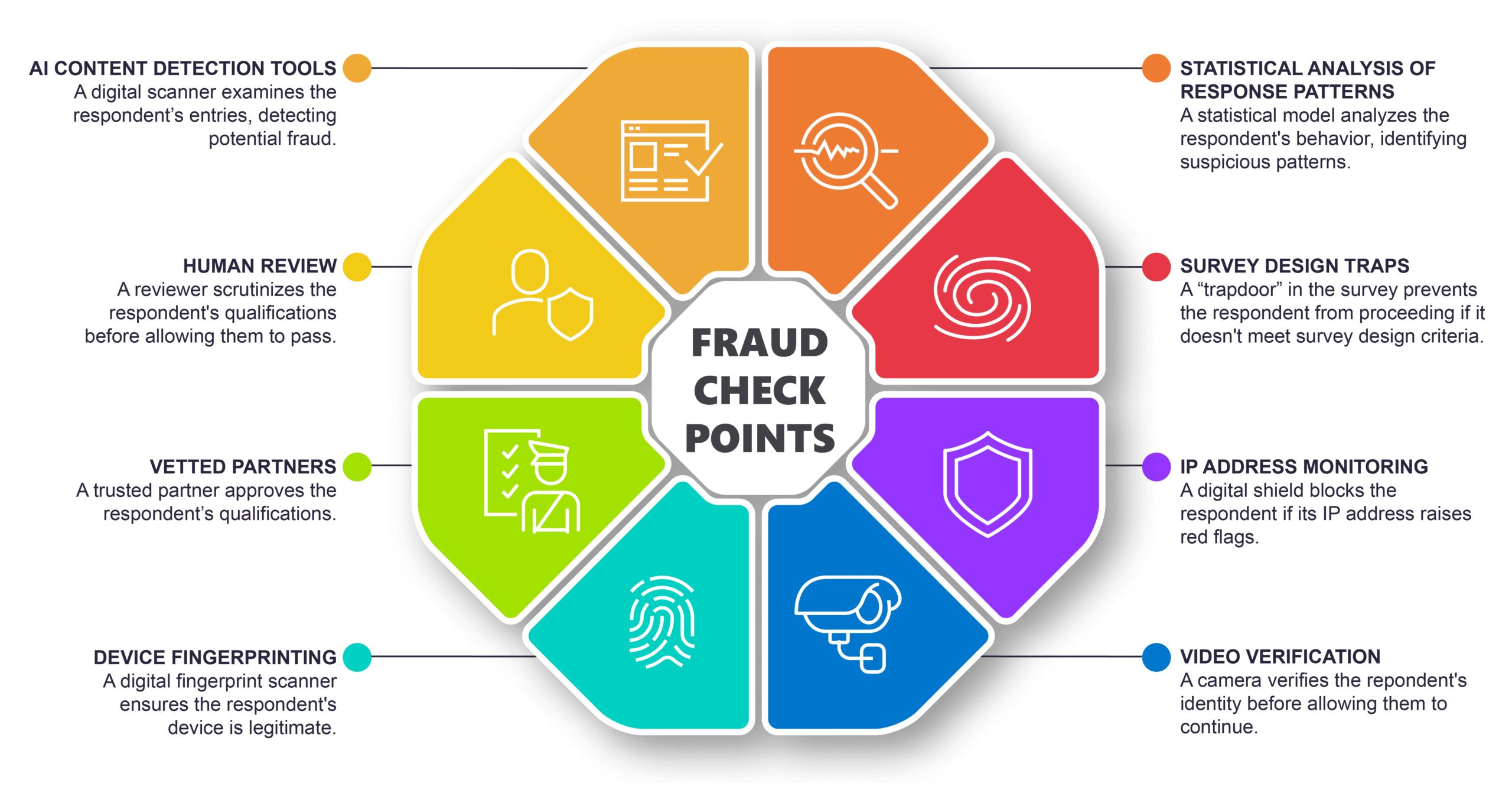 The rise of “click farms”, bots and Artificial Intelligence has led to the proliferation of bad actors across the industry that can threaten data integrity and undermine the validity of even the most well-designed research initiative. It is estimated that without using human and AI processes to prevent data fraud, 30% to 40% of data from online convenience sample quantitative studies are comprised with bots, imposters, and bad data.