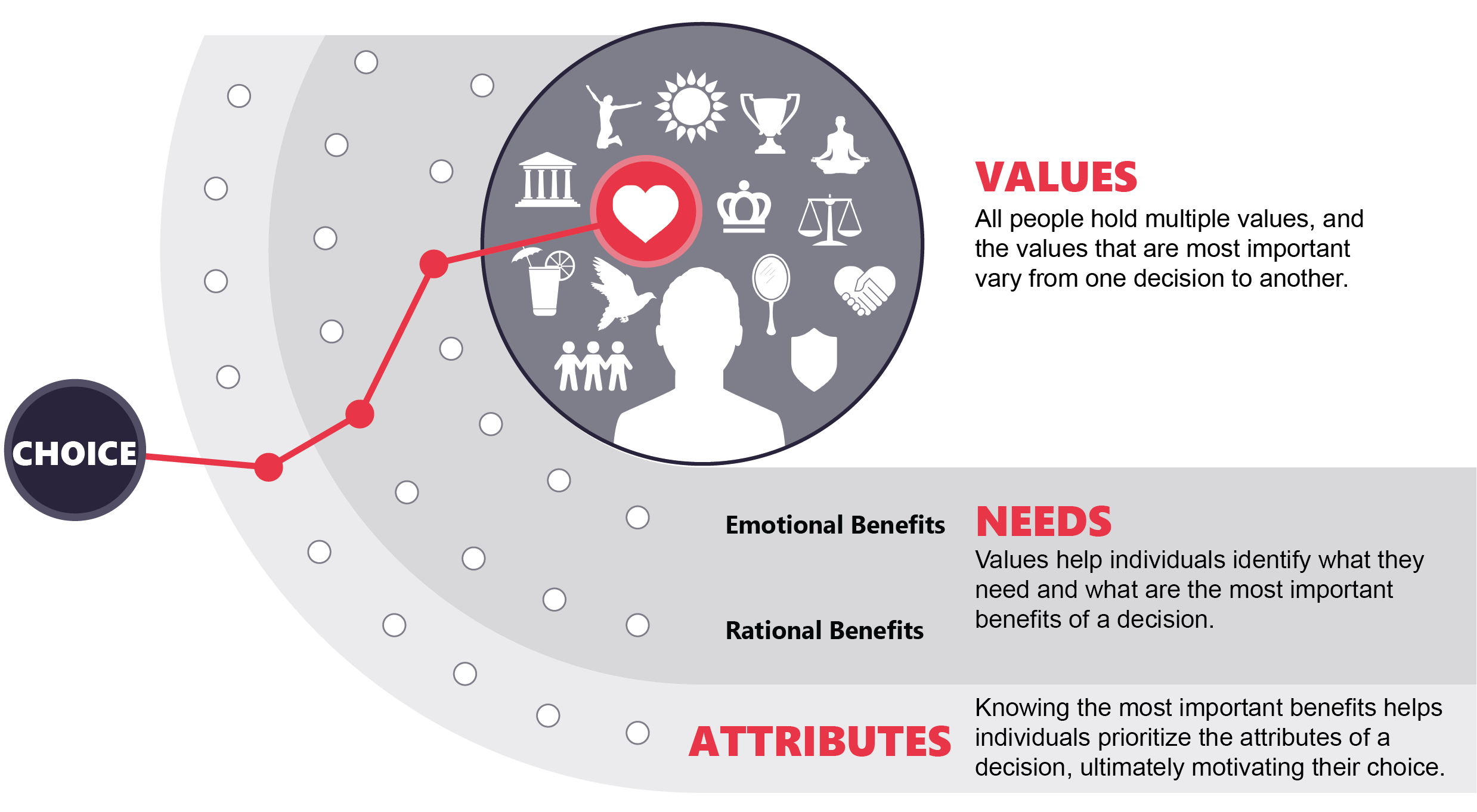 The key to using behavioral science in uncovering the role of values is illuminating the entire choice making process. To do this we rely on Means-End Theory frameworks, including values laddering, to understand how and why choices are made.